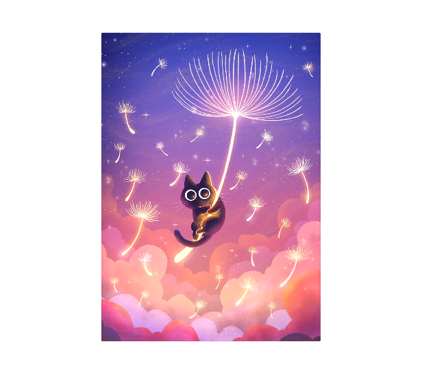 The "Dandelion Cat" poster combines the charm of a feline with the delicate beauty of dandelions. This enchanting artwork captures the essence of whimsy and nature, perfect for cat lovers. Its soft colors and imaginative design create a serene atmosphere, making it a delightful addition to any wall.