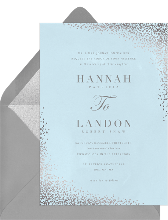 The shimmering confetti design features a bold blue background with white confetti. It will add an airy feel to your wedding invitations while setting the tone for an elegant celebration. This shimmering confetti design is perfect for a bride or groom who loves a fun and flirty celebration!